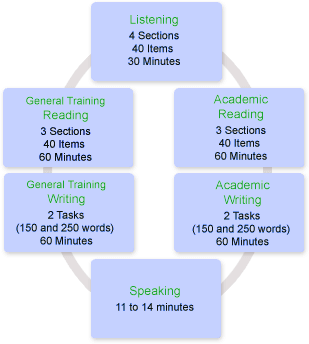 There are four sub-tests, or modules, to the IELTS test: Reading, Writing, Listening and Speaking. Students must sit all four sub-tests. While all students take the same Listening and Speaking tests, they sit different Reading and Writing tests, depending on whether they have selected the Academic IELTS test or the General Training IELTS test.